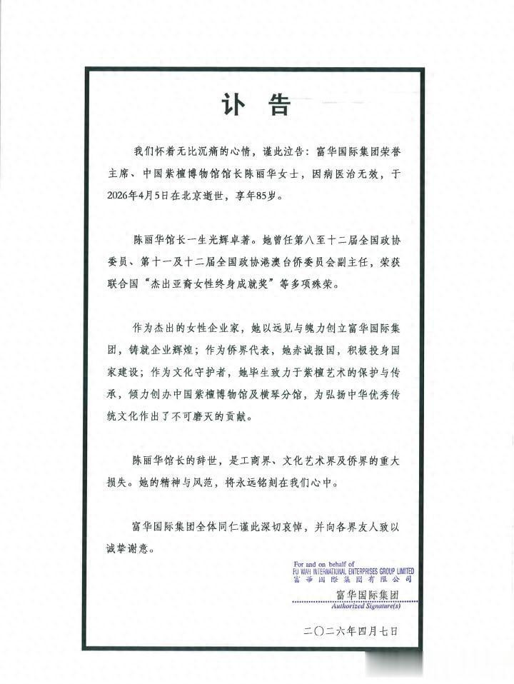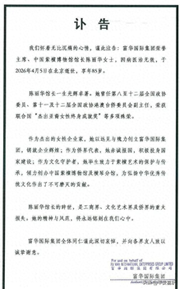 4月7号晚上,富华海外发了个精真金不怕火讣告,说陈丽华女士牺牲了。没写具体原因,也没提年齿,就一句话。我刷到的技术正坐在地铁上,手机屏幕亮得闪耀,驾驭东谈主折腰刷短视频,没东谈主语言。我多看了两眼那张配图:中国紫檀博物馆门口的石阶,窗明几净,连片落叶齐莫得。