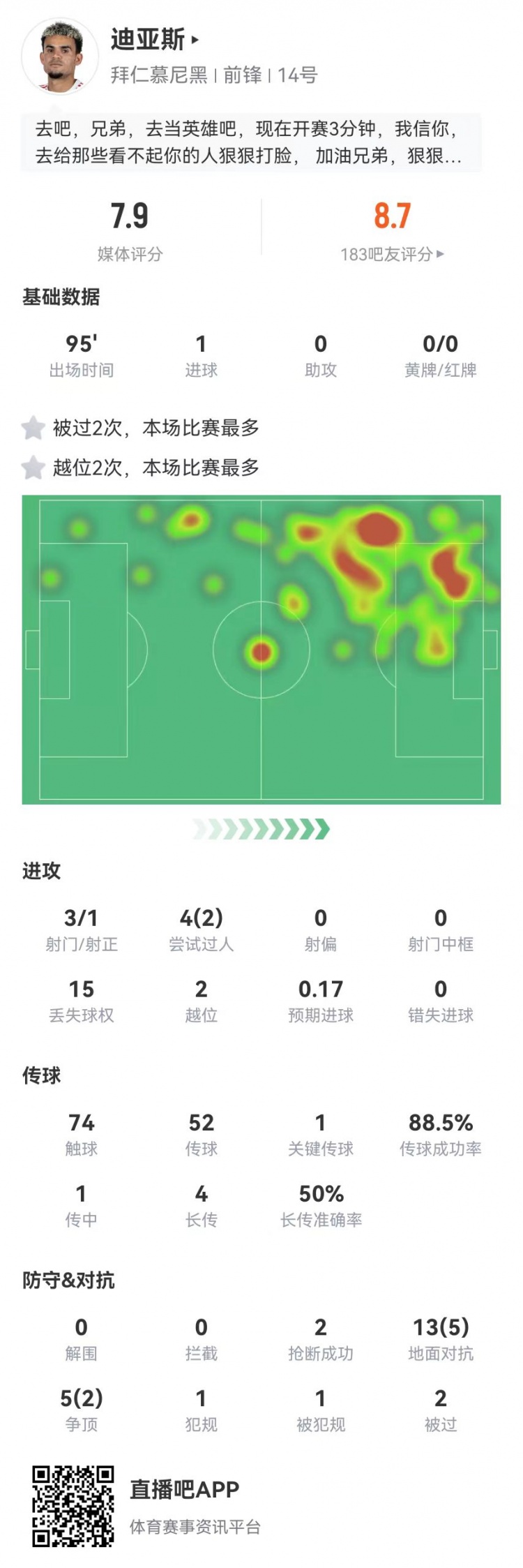 4月16日讯 拜仁在本轮欧冠主场4-3再胜皇马,迪亚斯本场数据如下: